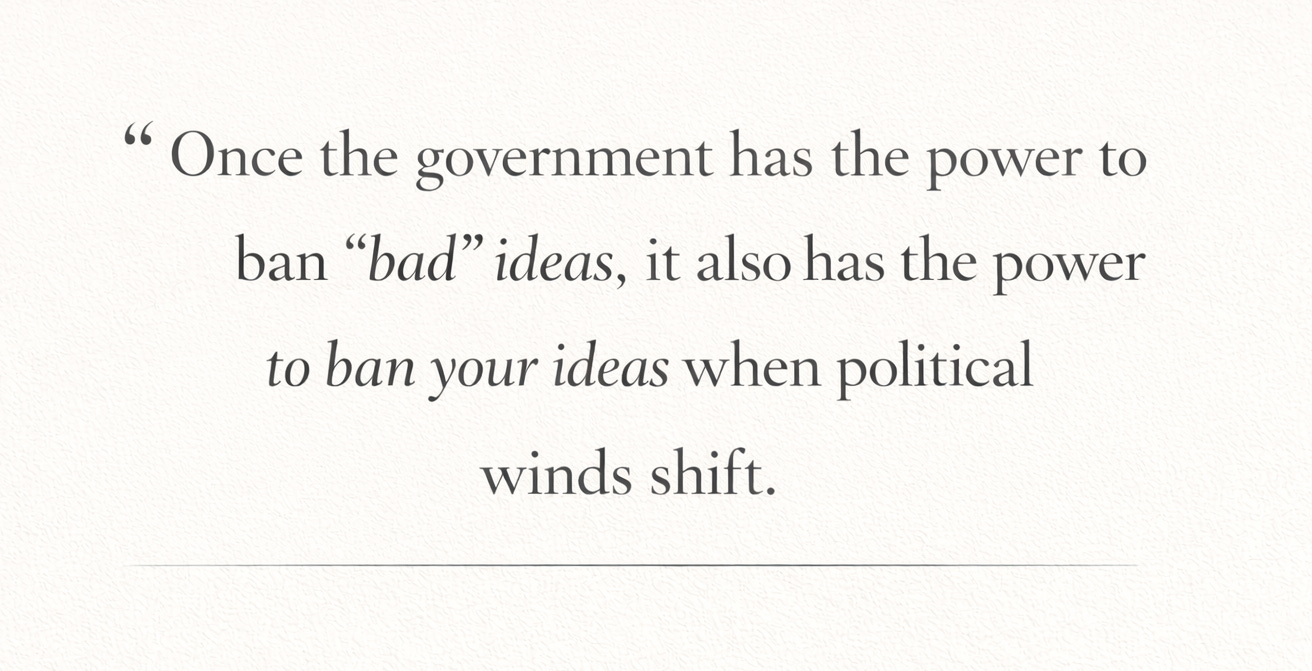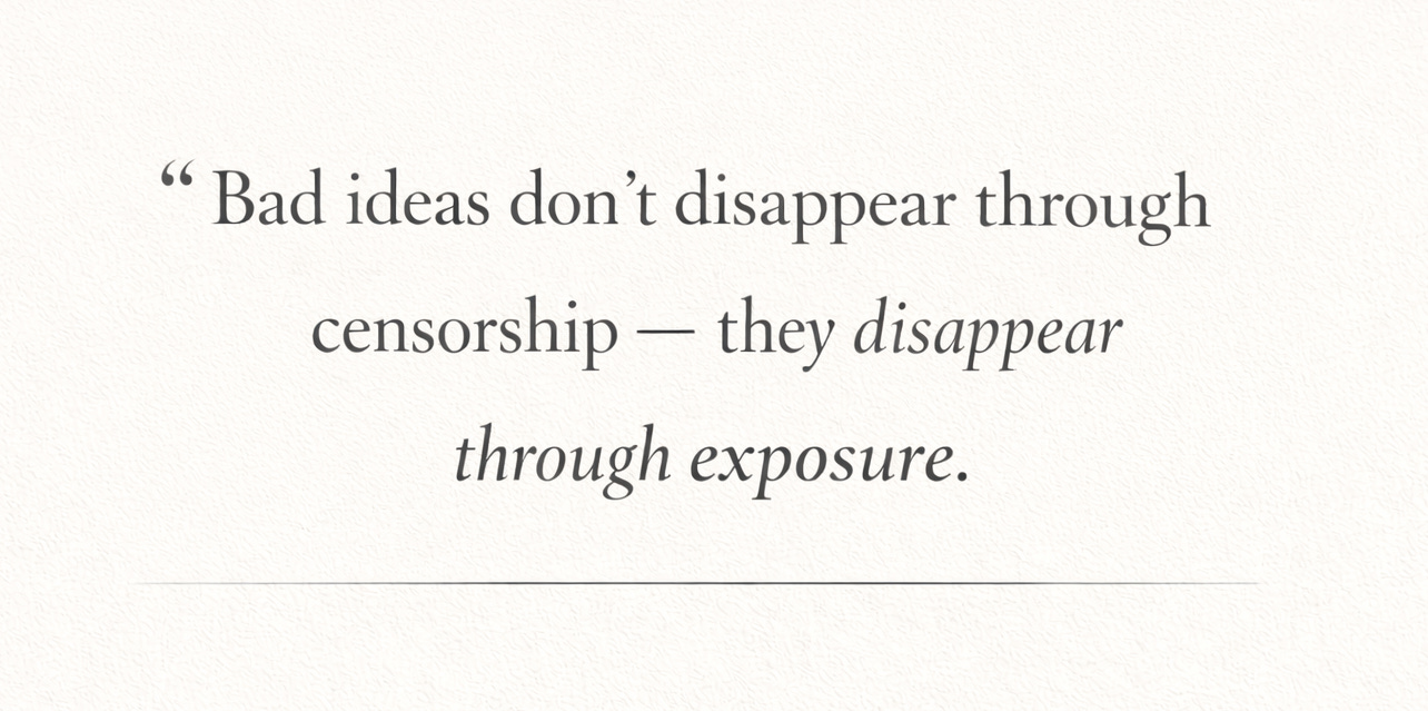 “Bad” ideas don’t disappear through censorship. They disappear through exposure. When ideas are pushed into the open, they can be scrutinized, criticized, and defeated on their merits.