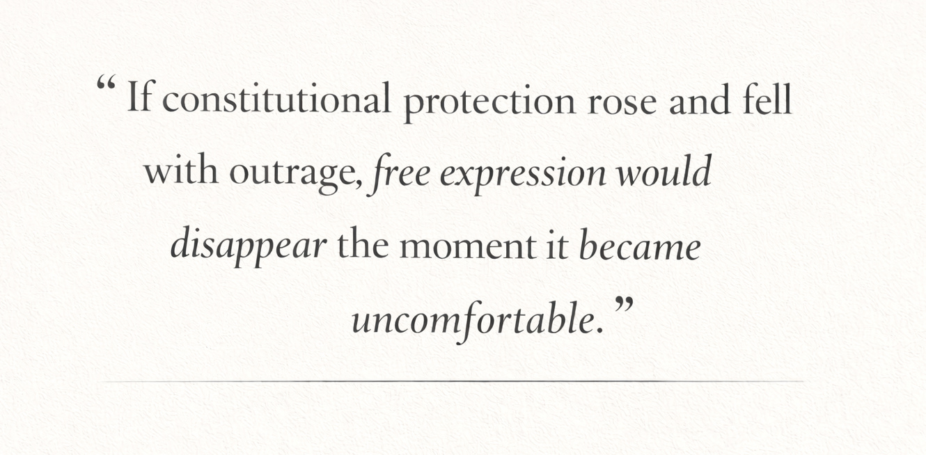 This is why “I’m offended” is not a constitutional standard. The First Amendment protects speech precisely because offense is subjective, emotional, and deeply dependent on personal experience. If constitutional protection rose and fell with outrage, free expression would disappear the moment it became uncomfortable.