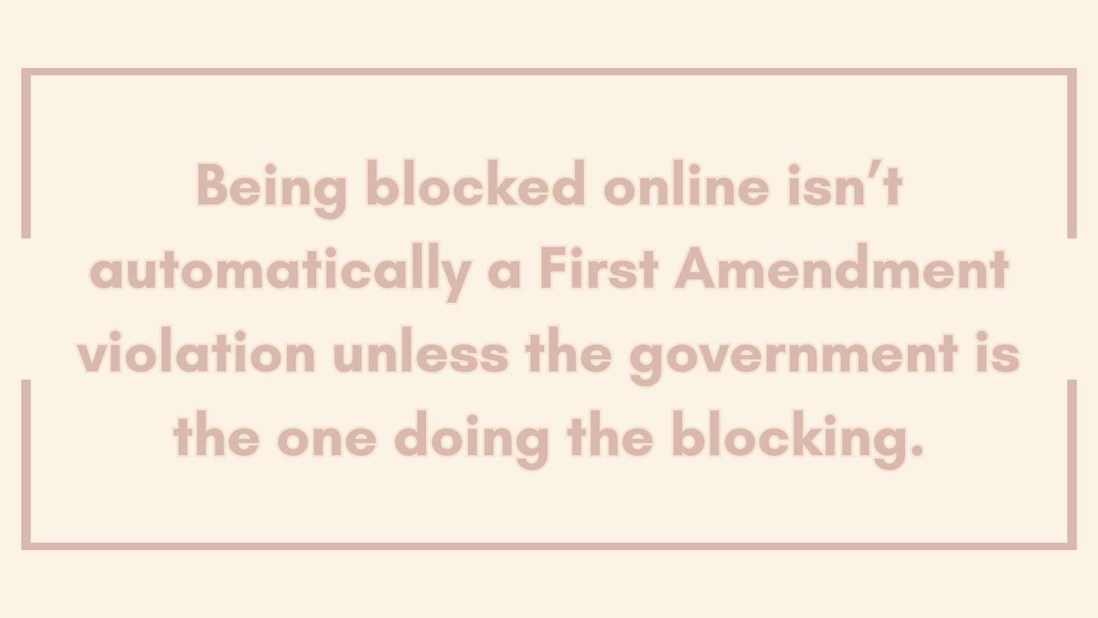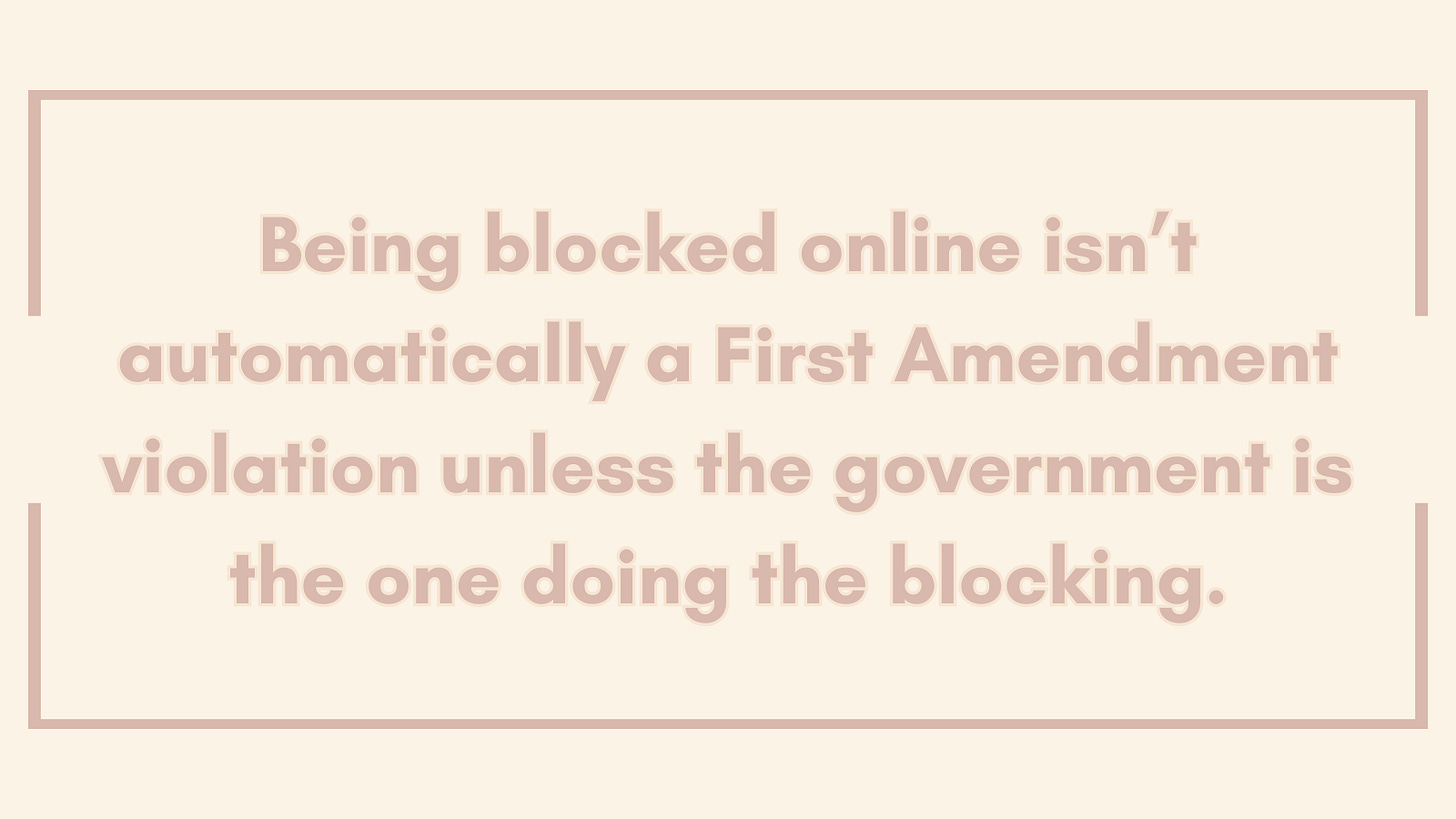Being blocked online isn’t automatically a First Amendment violation unless the government is the one doing the blocking.