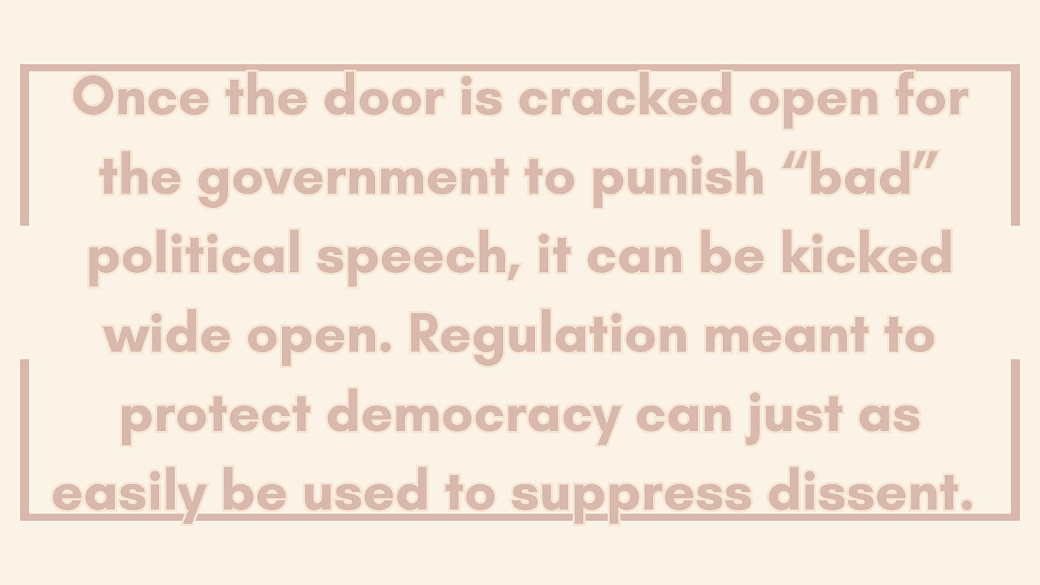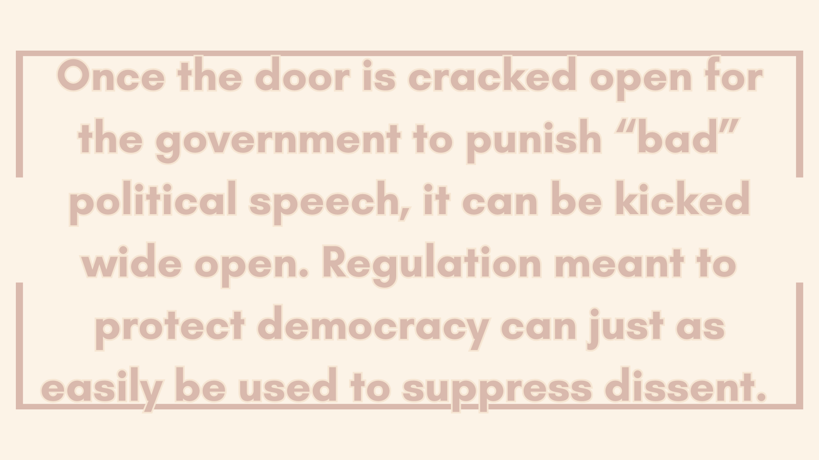 Once the door is cracked open for the government to punish “bad” political speech, it can be kicked wide open. Regulation meant to protect democracy can just as easily be used to suppress dissent.