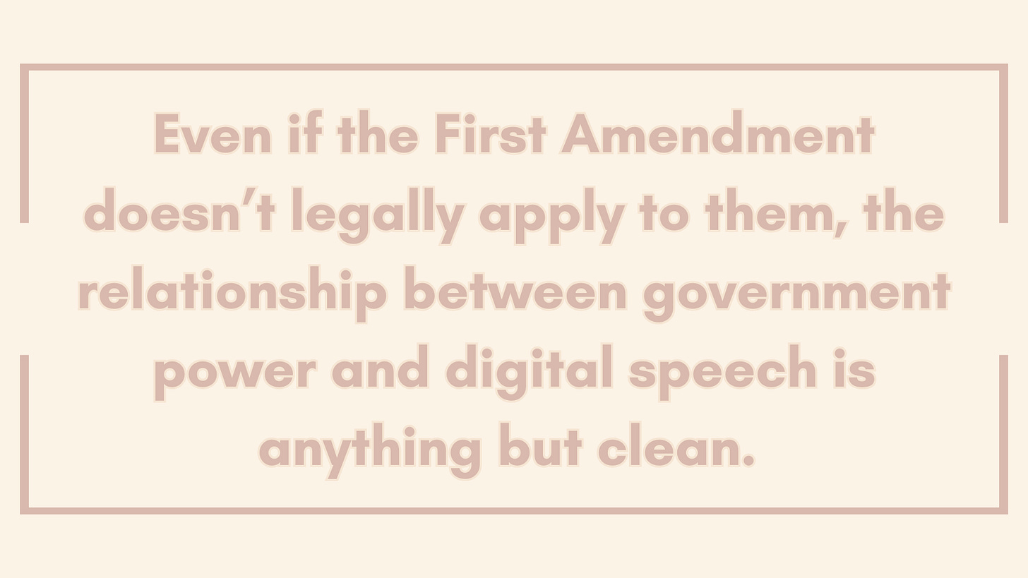 The idea that these platforms operate in a vacuum that is untouched by political pressure, regulation, or influence is becoming harder to believe. Even if the First Amendment doesn’t legally apply to them, the relationship between government power and digital speech is anything but clean.